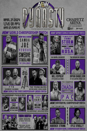 - AEW Dynasty was a professional wrestling pay-per-view (PPV) event produced by All Elite Wrestling (AEW). It took place on April 21, 2024, at Chaifetz Arena in St. Louis, Missouri, marking AEW's first pay-per-view event to be held in Missouri. Twelve matches were contested at the event, including three on the "Zero Hour" pre-show. In the main event, Swerve Strickland faced off against Samoa Joe to for the AEW World Championship.