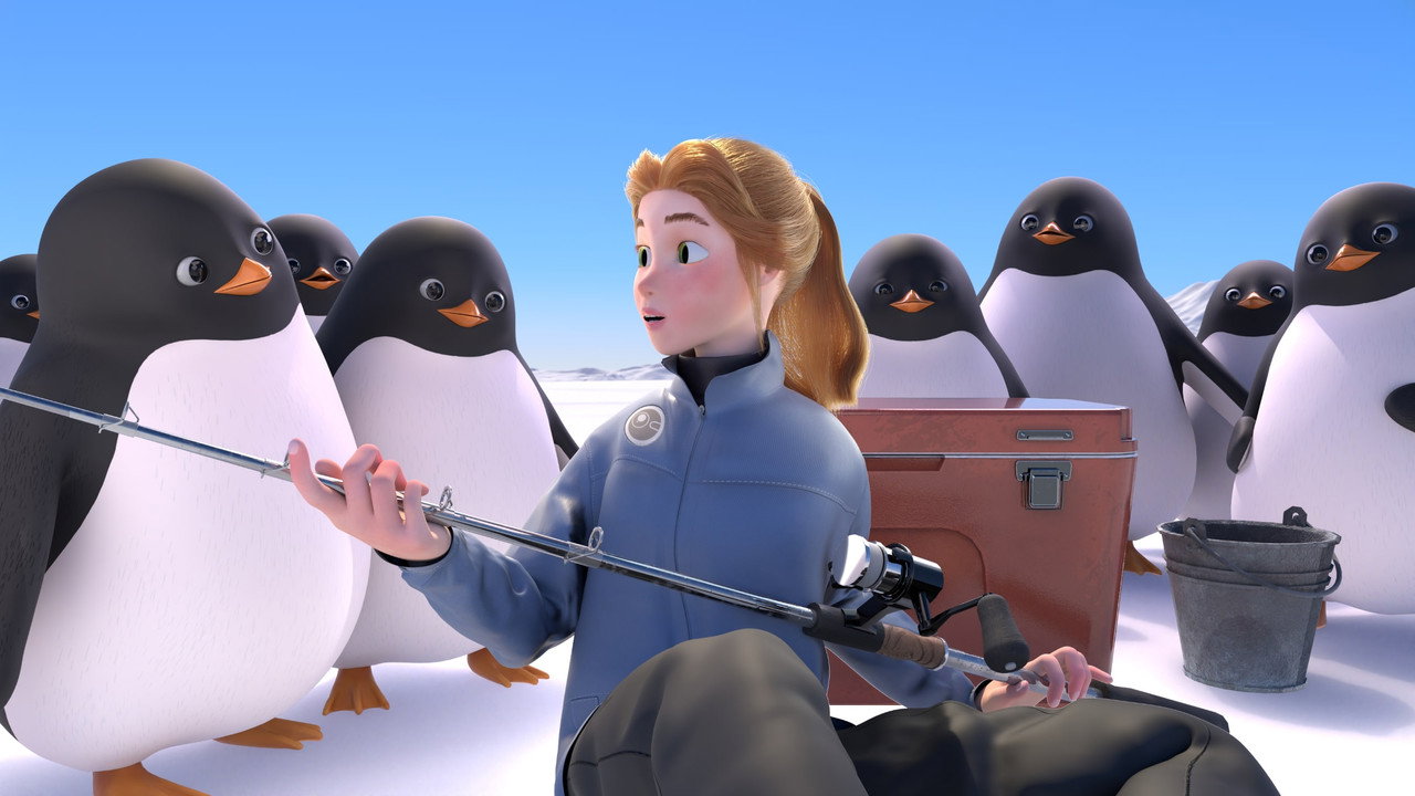 A fisherwoman is surprised by a flock of hungry penguins.
